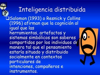 Este documento describe la teoría de la cognición distribuida, la cual sostiene que el pensamiento está socialmente situado y distribuido entre individuos y herramientas. Explica que la inteligencia está constituida por los recursos cognitivos humanos y las herramientas desarrolladas a lo largo de la historia. Además, señala que la cognición distribuida analiza cómo la coordinación entre individuos y artefactos da forma al sistema cognitivo y permite lograr metas a través de la interacción.