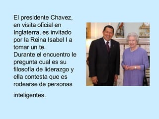 La Reina Isabel le hace una prueba al presidente Chávez para evaluar si sabe rodearse de personas inteligentes. Le pide a Tony Blair que responda a un acertijo cuya respuesta es él mismo. Chávez intenta hacer la misma prueba con varios de sus ministros y colaboradores, pero ninguno puede responder correctamente hasta que le pregunta a Guaicaipuro Lameda, quien acierta. Sin embargo, cuando Aristóbulo le informa a Chávez, éste le dice que la respuesta correcta era Tony Blair.