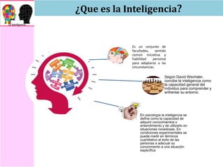 Este documento define la inteligencia como la capacidad de un individuo para comprender y adaptarse al entorno. Explica que la inteligencia está compuesta por operaciones mentales, contenidos y productos, y puede medirse cuantitativamente. También discute que la inteligencia es influenciada tanto por factores hereditarios como ambientales, y define habilidades verbales, numéricas, espaciales y de razonamiento como componentes de la inteligencia.