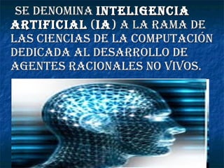 La inteligencia artificial es la rama de la ciencia de la computación dedicada al desarrollo de agentes no vivos que puedan percibir su entorno, procesar esas percepciones y actuar de manera racional para maximizar un objetivo, basándose en el conocimiento almacenado. La racionalidad se refiere a la capacidad humana de pensar, evaluar y actuar de acuerdo a principios de optimidad y consistencia. La inteligencia artificial construye procesos que producen acciones maximizando un rendimiento determinado, basándose en las entradas