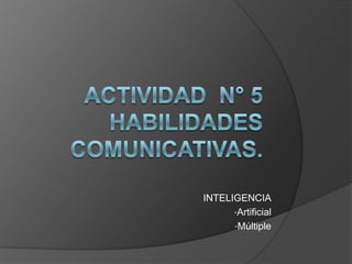 El documento define la inteligencia como la capacidad del cerebro humano para procesar información y resolver problemas. Explica que existen diferentes tipos de inteligencia, incluyendo la inteligencia lógico-matemática, lingüística, espacial, corporal, musical, interpersonal, intrapersonal y naturalista. Además, introduce los conceptos de inteligencia artificial y múltiple, señalando que la inteligencia no es algo unitario sino un conjunto de capacidades distintas.