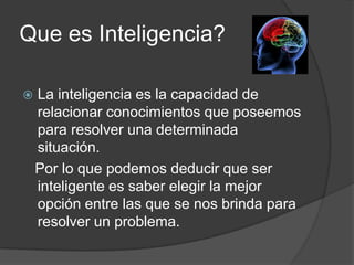 La inteligencia se define como la capacidad de relacionar conocimientos para resolver problemas. Existen diferentes tipos de inteligencia como la lógico-matemática, lingüística, espacial, corporal, musical, interpersonal, intrapersonal y naturalista. La inteligencia artificial se refiere a modelos propuestos para entender la inteligencia como un conjunto de capacidades distintas e independientes más que como algo unitario.