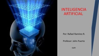 El documento presenta una introducción a la inteligencia artificial, definiéndola como la simulación de procesos de inteligencia humana por parte de máquinas. Explica tres tipos de IA y ofrece ejemplos actuales de su aplicación en medicina, educación e industria. Finalmente, resume ventajas como la solución de problemas y desventajas como la inseguridad de información y el aislamiento de la sociedad.