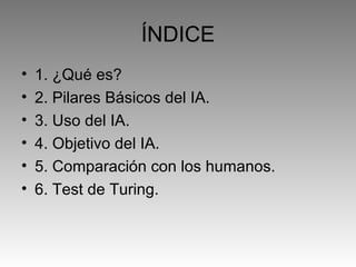 Este documento resume los conceptos clave de la inteligencia artificial. Explica que la IA estudia la creación de sistemas capaces de resolver problemas utilizando la inteligencia humana como paradigma. Detalla los cuatro pilares básicos de la IA y algunos de sus usos comunes. Además, describe el objetivo de la IA de construir modelos computacionales que resuelvan tareas similares a los humanos y compara las limitaciones de los sistemas de IA frente al razonamiento humano. Por último, explica el test de Turing como una prueba para evaluar