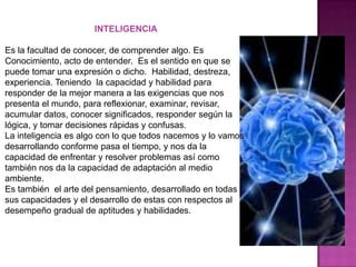 El documento define la inteligencia como la capacidad de conocer, comprender y resolver problemas. Explica que existen dos tipos principales de inteligencia artificial: la inteligencia artificial convencional basada en reglas y la inteligencia artificial computacional basada en aprendizaje. También menciona algunas aplicaciones comunes de la inteligencia artificial como la robótica, el procesamiento de lenguaje natural y los sistemas expertos.