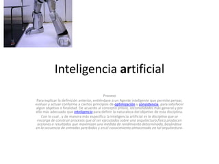 La inteligencia artificial es un proceso que permite que un agente piense, evalúe y actúe de acuerdo a principios de optimización y consistencia para satisfacer un objetivo. Específicamente, la inteligencia artificial construye procesos que cuando son ejecutados en una arquitectura física, producen acciones que maximizan el rendimiento basado en las entradas percibidas y el conocimiento almacenado. La inteligencia artificial se encarga de construir agentes racionales que satisfacen sus objetivos.
