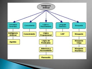 Este documento discute la inteligencia artificial y su relación con la inteligencia humana. Define la IA como una rama de la computación que crea analogías artificiales a través de programas para comprender el conocimiento humano. También describe cómo se han desarrollado sistemas expertos que pueden imitar la capacidad mental humana para diagnosticar problemas y ofrecer soluciones más rápidas que los humanos. Finalmente, introduce las siete inteligencias básicas propuestas por Howard Gardner, incluyendo la lingüística, corporal-kinética, musical, interpersonal