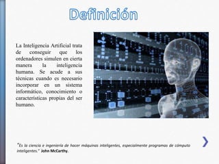La inteligencia artificial trata de simular la inteligencia humana mediante el desarrollo de sistemas informáticos que piensan y actúan como humanos o que resuelven problemas de manera racional. Se utilizan diferentes técnicas como redes neuronales artificiales, sistemas expertos y agentes inteligentes.