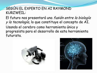 El documento resume las ideas del experto en inteligencia artificial Raymond Kurzweil sobre el futuro de la fusión entre la biología y la tecnología. Kurzweil predice que avances como nanobots, máquinas cerebrales y dispositivos electrónicos implantables ayudarán a mejorar la salud y longevidad humanas. También anticipa que en 15 años habrá aumentos en la inteligencia y memoria humanas a través de modificaciones genéticas, y la creación de entornos virtuales donde las mentes puedan fusionarse.