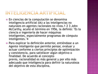 La inteligencia artificial (IA) se refiere a la inteligencia no natural en agentes racionales no vivos como programas de computadora. John McCarthy acuñó el término en 1956 y lo definió como la ciencia y la ingeniería de hacer máquinas inteligentes, especialmente programas de computadora inteligentes. La IA incluye sistemas que piensan como humanos mediante el aprendizaje y la toma de decisiones, sistemas que piensan racionalmente a través de la lógica y sistemas que actúan racionalmente para emular