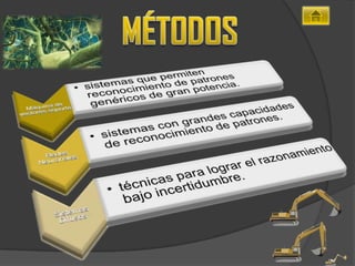 Este documento resume la historia y las ramas principales de la inteligencia artificial. Se divide en cinco etapas desde 1956 hasta 1980 que marcan el inicio y desarrollo de la IA, con énfasis en juegos de computadora y demostración de teoremas al principio. La IA se divide en dos escuelas de pensamiento: IA computacional basada en análisis formal y estadístico del comportamiento humano, e IA convencional que implica aprendizaje interactivo. Algunas ramas principales son sistemas expertos, redes bayesianas,