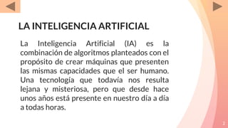 La inteligencia artificial (IA) combina algoritmos para crear máquinas con capacidades similares a los humanos. Existen cuatro tipos principales de IA: sistemas que piensan como humanos mediante aprendizaje profundo, sistemas que actúan como humanos como los robots, sistemas que piensan racionalmente como los sistemas expertos, y sistemas que actúan racionalmente como los agentes inteligentes. La IA se utiliza en aplicaciones como el reconocimiento facial en teléfonos, asistentes de voz y bots para mejorar la vida de las
