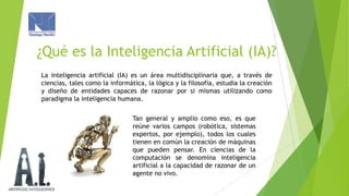 El documento presenta información sobre inteligencia artificial (IA). Explica que la IA estudia la creación de entidades capaces de razonar por sí mismas utilizando la inteligencia humana como paradigma. Divide la IA en cuatro categorías: sistemas que piensan como humanos, sistemas que actúan como humanos, sistemas que piensan racionalmente, y sistemas que actúan racionalmente. También discute el futuro potencial de la IA y los avances en IA que se están logrando en Venezuela, particularmente en universidades y en aplicaciones médic