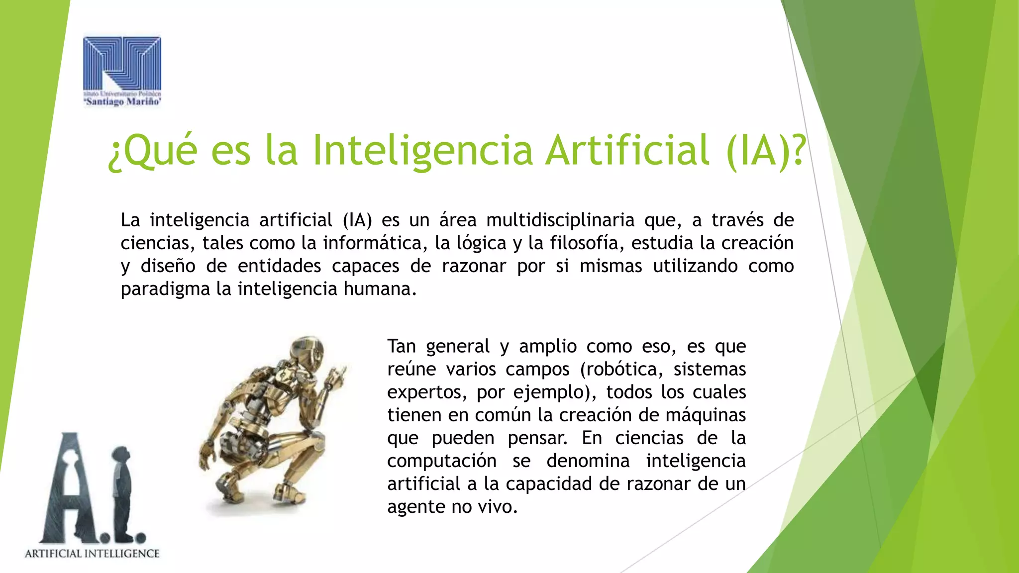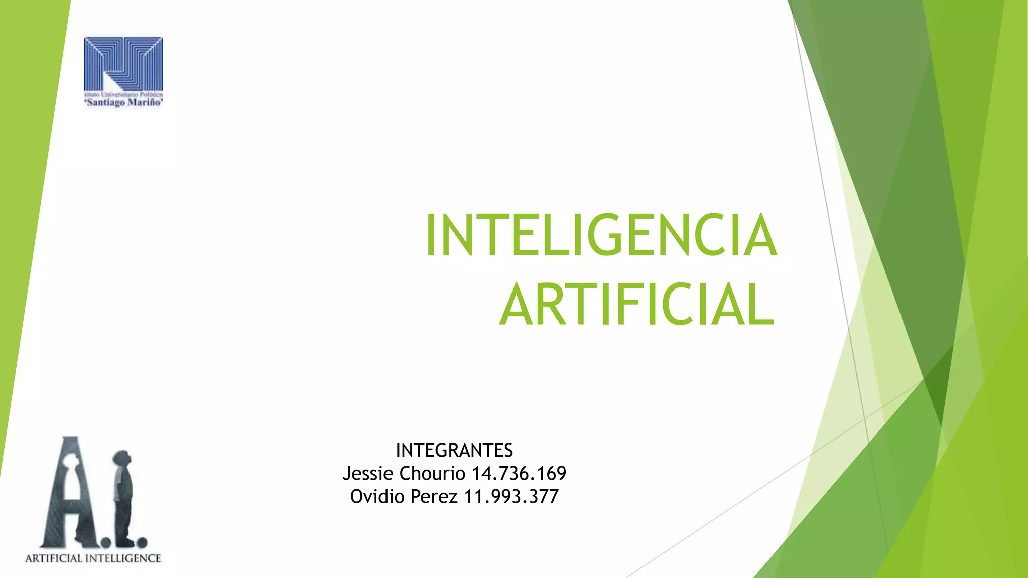 El documento presenta información sobre inteligencia artificial (IA). Explica que la IA estudia la creación de entidades capaces de razonar por sí mismas utilizando la inteligencia humana como paradigma. Divide la IA en cuatro categorías: sistemas que piensan como humanos, sistemas que actúan como humanos, sistemas que piensan racionalmente, y sistemas que actúan racionalmente. También discute el futuro potencial de la IA y los avances en IA que se están logrando en Venezuela, particularmente en universidades y en aplicaciones médic