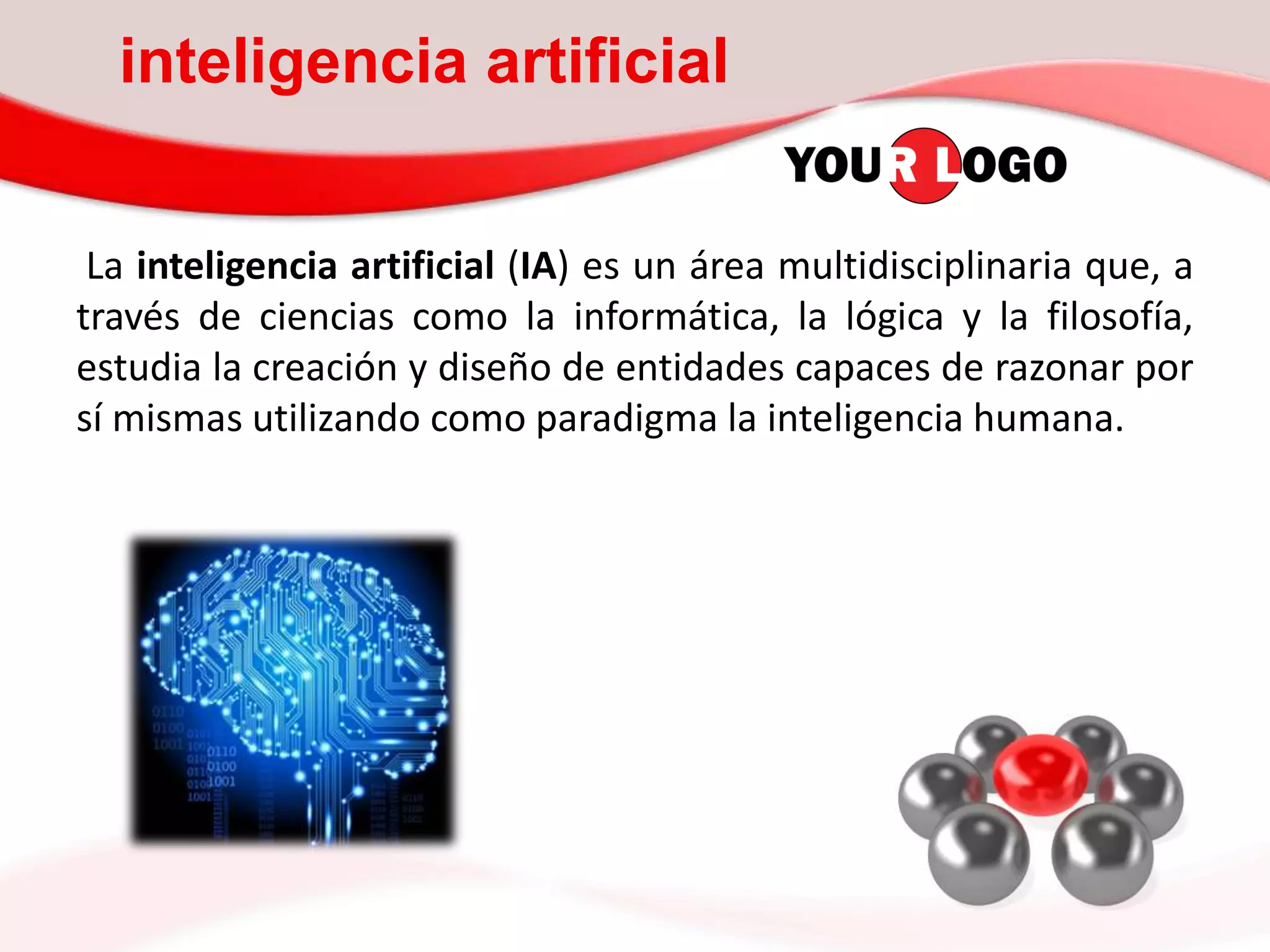La inteligencia artificial es el estudio interdisciplinario de cómo crear sistemas que puedan razonar por sí mismos imitando la inteligencia humana. Se divide en dos escuelas: la convencional basada en el análisis formal del comportamiento humano, y la computacional que implica aprendizaje interactivo. Su objetivo es imitar el cerebro humano en todas sus funciones, aunque las críticas señalan que no puede replicar por completo a un ser humano. Tiene muchas aplicaciones como lingüística, minería de datos, medicina