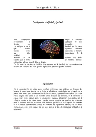 El documento proporciona una introducción a la inteligencia artificial, describiendo sus orígenes en la década de 1940 y la definición formal del término en 1956. Explica algunas aplicaciones actuales de la IA en finanzas, medicina, industria y atención al cliente. Resalta los avances recientes de compañías como Google, Apple, Microsoft y Honda en el desarrollo de asistentes virtuales y vehículos autónomos.