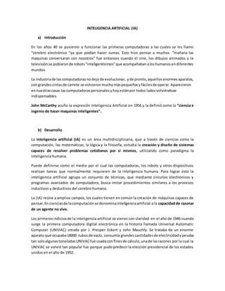 La inteligencia artificial (IA) se refiere al área multidisciplinaria que estudia cómo crear sistemas capaces de resolver problemas por sí mismos utilizando la inteligencia humana como paradigma. Se desarrolló en los años 40 y 50 con las primeras computadoras y ha avanzado gracias a avances en computación, matemáticas, lógica y filosofía. Actualmente, la IA incluye aplicaciones como autos que pueden conducirse solos, sistemas médicos de diagnóstico y edificios inteligentes.