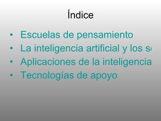 Este documento resume dos escuelas de pensamiento en inteligencia artificial: la inteligencia artificial convencional basada en análisis formal y estadístico del comportamiento humano, y la inteligencia computacional basada en aprendizaje interactivo a partir de datos empíricos. También describe aplicaciones como la lingüística computacional, la robótica y la mecatrónica, así como tecnologías de apoyo como interfaces de usuario y visión artificial.