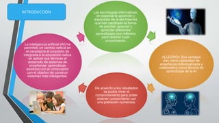 Este documento describe un estudio realizado por una facultad de la Universidad Nacional de Colombia sobre el uso del Entorno de Aprendizaje ALLERGO y el entorno tradicional. Al final del curso, los resultados de los estudiantes evaluados mostraron que aquellos en el Entorno ALLERGO tuvieron un mejor desempeño en habilidades como la memorización, razonamiento y competencia lectora. Las mayores ventajas de ALLERGO son su capacidad para ofrecer enseñanza individualizada y colaborativa al mismo tiempo mediante técnicas de aprendiz