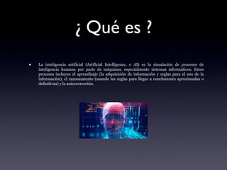 El documento describe los diferentes tipos de inteligencia artificial, incluyendo máquinas reactivas con capacidad limitada de memoria, sistemas con capacidad de aprendizaje basado en experiencias pasadas, y tipos avanzados aún no desarrollados que involucran teoría de la mente y autoconocimiento. También provee ejemplos de aplicaciones actuales como generación de lenguaje natural, reconocimiento de voz, agentes virtuales y plataformas de aprendizaje profundo.