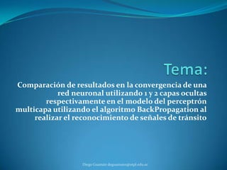 Este proyecto compara la convergencia de redes neuronales con una y dos capas ocultas utilizando el algoritmo de backpropagation para el reconocimiento de señales de tránsito. Se desarrolló un modelo con diferentes configuraciones de neuronas en las capas ocultas para evaluar su eficiencia en la clasificación de nuevas señales. Los resultados mostraron que una sola capa oculta ofreció un mejor rendimiento y menor tiempo de convergencia.