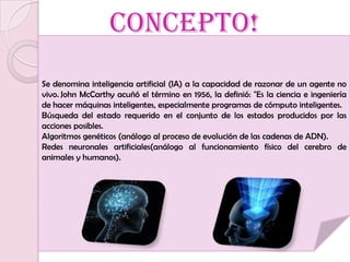 El documento define la inteligencia artificial como la capacidad de razonar de un agente no vivo. Explica que John McCarthy acuñó el término en 1956 y lo definió como la ciencia e ingeniería de hacer máquinas inteligentes, especialmente programas de cómputo inteligentes. Además, menciona que la inteligencia artificial incluye algoritmos genéticos y redes neuronales artificiales.