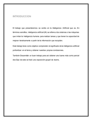 Este documento trata sobre la inteligencia artificial. Explica que la IA se refiere a sistemas que imitan la inteligencia humana para realizar tareas y mejorar con la información. Luego describe los orígenes y desarrollo histórico de la IA, incluyendo contribuciones de Alan Turing, John McCarthy y otros. Finalmente, analiza aplicaciones de la IA en marketing, recursos humanos, atención al cliente y finanzas.