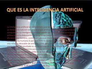 La inteligencia artificial puede ser considerada como una ciencia o ingeniería. Como ciencia, se enfoca en comparar la eficiencia de programas con la inteligencia humana. Como ingeniería, busca crear programas de alta eficiencia mediante el uso de reglas de entrada y salida. A través de la inteligencia artificial se han desarrollado sistemas expertos que pueden imitar la capacidad mental humana y hacer juicios sobre problemas con mayor precisión y rapidez que las personas.