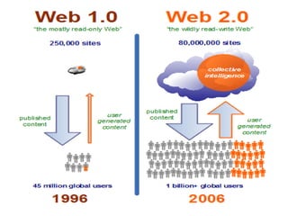 El documento describe la inteligencia colectiva como la inteligencia que emerge de la colaboración entre muchos individuos, donde el conjunto es más que la suma de sus partes. Da como ejemplos de inteligencia colectiva a Google, Wikipedia y YouTube. Explica que la Web 2.0 permitió que la gente creara y actualizara fácilmente contenido en la web, a diferencia de la Web 1.0 que era principalmente de solo lectura.