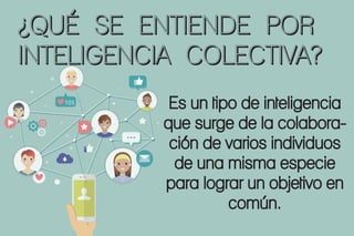La inteligencia colectiva surge de la colaboración de varios individuos para lograr un objetivo común. Funciona de manera conjunta sin jerarquía u organización, a través de un pensamiento compartido. Existen dos tipos principales: la inteligencia colectiva piramidal y la inteligencia colectiva en enjambre.