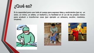 Este documento describe la inteligencia corporal-kinestésica, que incluye habilidades físicas como la coordinación, el equilibrio, la destreza, la fuerza, la flexibilidad, la velocidad y la percepción táctil y de medidas. Esta inteligencia permite a las personas utilizar todo su cuerpo para expresar ideas y sentimientos, así como utilizar sus manos para crear o reparar objetos. El control del movimiento corporal se localiza principalmente en la corteza motora.