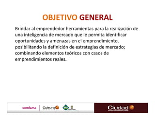 Este documento presenta los objetivos y componentes clave para realizar un estudio de mercado que permita a los emprendedores identificar oportunidades y estrategias. El objetivo general es brindar herramientas para realizar una inteligencia de mercado que identifique oportunidades y amenazas, posibilitando la definición de estrategias. Se explican conceptos como análisis sectorial, de mercado y plan de mercadeo.