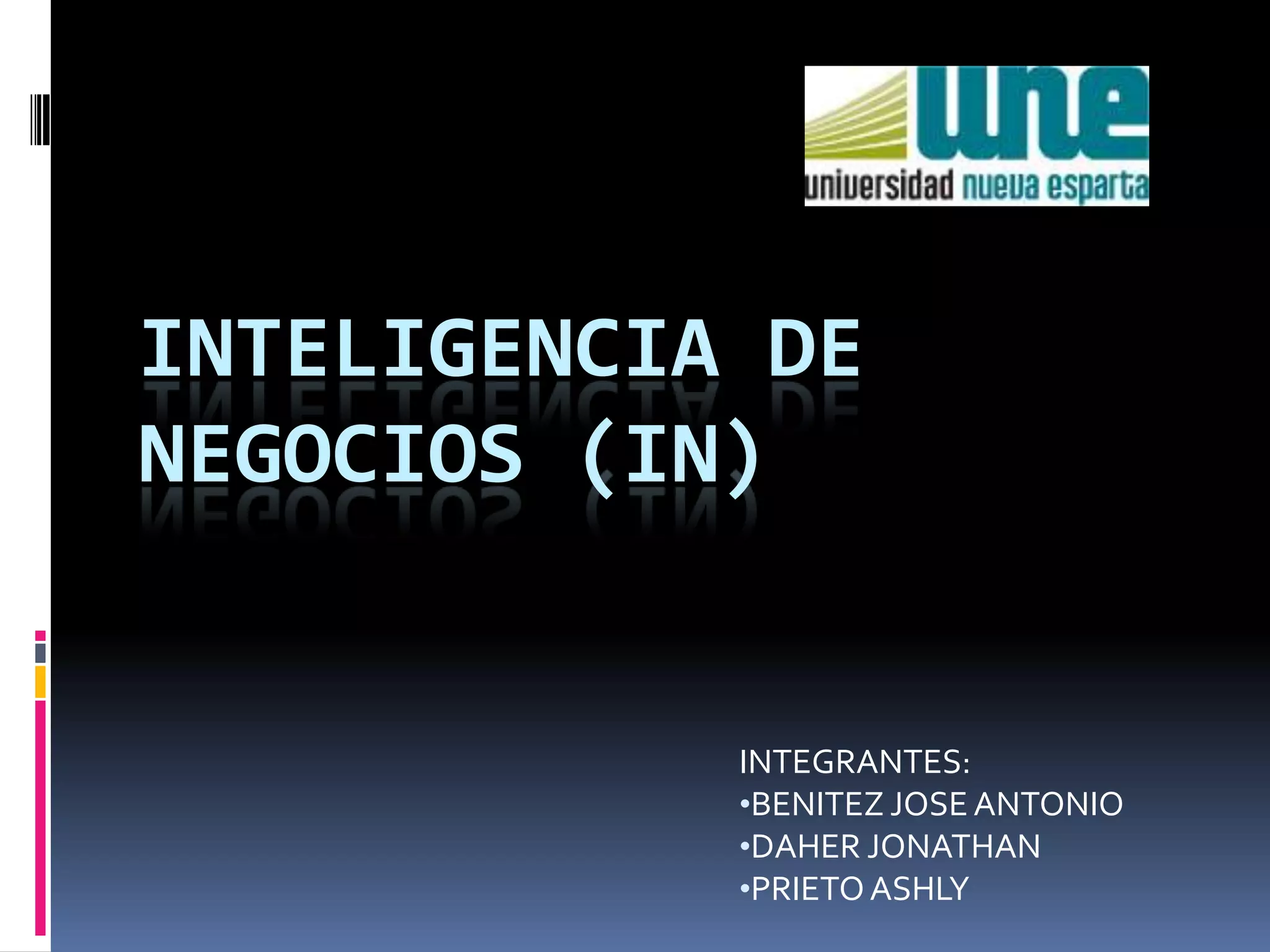 La inteligencia de negocios (IN) usa datos de una empresa para facilitar la toma de decisiones mediante la comprensión del funcionamiento actual y anticipación del futuro de la empresa. Ofrece informes, consultas, análisis estadísticos y pronósticos para respaldar las decisiones empresariales. La IN surgió en los años 80 y se extendió en los 90 como un término para mejorar la toma de decisiones a través de sistemas basados en hechos.