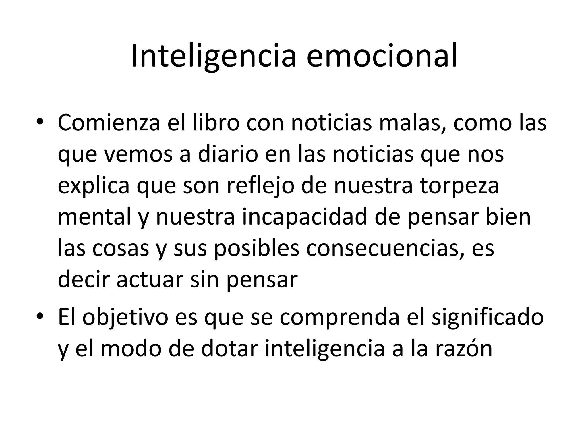 Este documento resume un libro sobre inteligencia emocional. Explica que personas muy inteligentes académicamente a veces arruinan sus vidas al no poder controlar sus emociones. Da el ejemplo de un estudiante con notas perfectas que apuñaló a su maestro después de recibir una mala calificación. También discute la importancia de la inteligencia emocional, incluyendo la capacidad de motivarse, controlar los impulsos y empatizar con los demás.