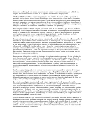 El documento describe la evolución del concepto de inteligencia emocional y su importancia en diferentes ámbitos como la educación, los negocios y la ciencia. Explica que las emociones están reguladas por la amígdala cerebral y que, aunque originalmente evolucionaron para garantizar la supervivencia, en la actualidad pueden conducir a respuestas desproporcionadas debido a los atajos neuronales entre los sentidos y la amígdala.