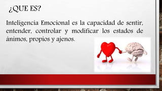 La inteligencia emocional es la capacidad de sentir, entender, controlar y modificar los estados de ánimo propios y ajenos. Genera habilidades internas como el autoconocimiento y habilidades externas como la empatía y destreza social. Estudios muestran que mejora el rendimiento escolar y evita problemas como ansiedad y estrés. La inteligencia emocional es más importante que el coeficiente intelectual para tener éxito en el trabajo y las relaciones.