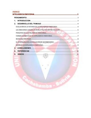 Este documento trata sobre la inteligencia emocional. Explica la evolución histórica del concepto de inteligencia emocional y cómo las emociones juegan un papel vital en nuestro día a día. También describe los principios básicos de la inteligencia emocional, las formas elementales, el respaldo científico y los modelos de inteligencia emocional. El documento concluye que la regulación de las emociones se puede aprender y es un signo de madurez.