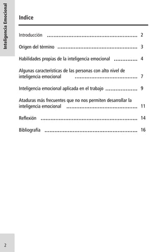 Este documento describe la inteligencia emocional, incluyendo su origen, habilidades clave como la conciencia de sí mismo y la empatía, y características de personas con alto nivel de inteligencia emocional. También discute cómo la inteligencia emocional se puede aplicar en el trabajo mediante aptitudes interpersonales y sociales, y las ataduras que pueden impedir su desarrollo como la dependencia de cosas u otros.