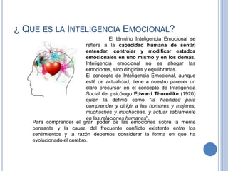El documento discute la inteligencia emocional, que se refiere a la capacidad humana de sentir, entender, controlar y modificar estados emocionales. Explica que la inteligencia emocional no es reprimir las emociones, sino dirigirlas y equilibrarlas. También explora las teorías de Edward Thorndike sobre la inteligencia social y las siete inteligencias de Howard Gardner, incluida la inteligencia interpersonal e intrapersonal. Finalmente, analiza la relación entre la ética y la inteligencia emocional, argumentando que el