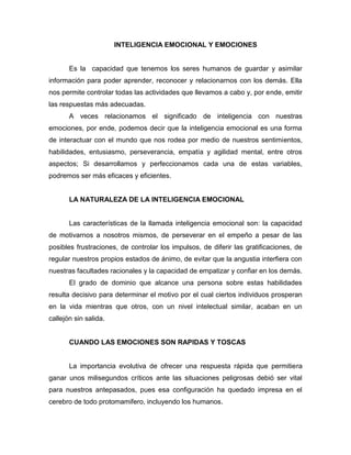 Este documento presenta información sobre la inteligencia emocional en 4 oraciones. Explica que la inteligencia emocional es la capacidad de procesar información para aprender y relacionarse con los demás, y que involucra el control de las emociones y respuestas. También describe que la amígdala cerebral genera respuestas emocionales rápidas, mientras que el lóbulo prefrontal ayuda a modular esas respuestas para generar una respuesta más analítica. Además, señala que las emociones guían las decisiones trabajando j