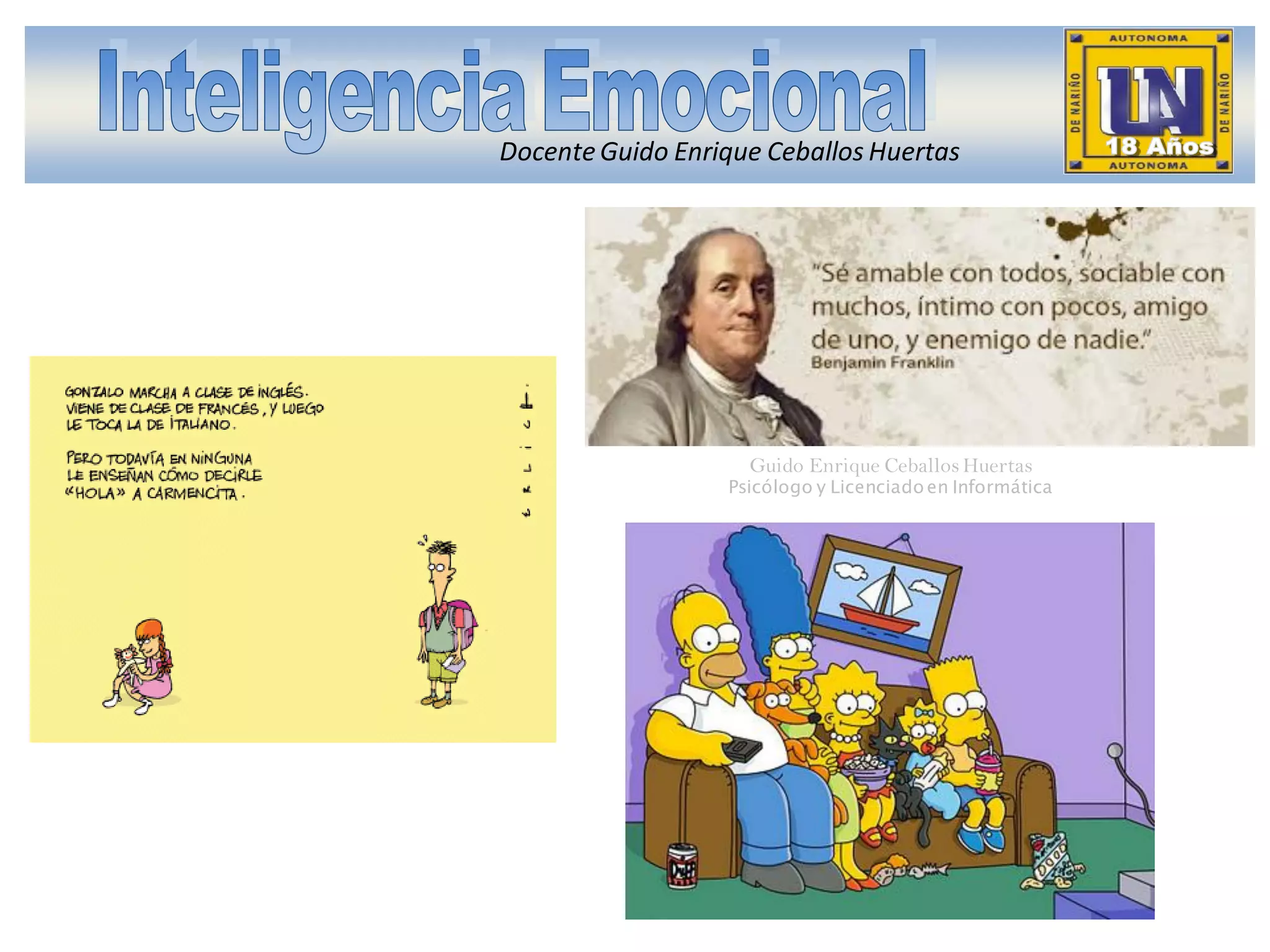 El documento presenta información sobre Guido Enrique Ceballos Huertas, quien es psicólogo y licenciado en informática. También se describen conceptos clave sobre inteligencia emocional, incluyendo sus componentes principales como autoconocimiento, autorregulación, empatía y habilidades sociales. Además, se explica que la inteligencia emocional puede desarrollarse a través del esfuerzo y es importante para el desempeño y éxito en la vida.