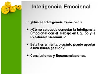 El documento habla sobre inteligencia emocional. Explica que la inteligencia emocional se refiere a la capacidad de reconocer los propios sentimientos y los de los demás, motivarse adecuadamente y manejar las relaciones. La inteligencia emocional se basa en 5 aptitudes como el autoconocimiento, la autorregulación, la motivación, la empatía y las habilidades sociales. También discute cómo la inteligencia emocional se puede conectar con el trabajo en equipo y la excelencia gerencial en el ámbito empresarial.