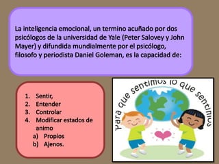Este documento trata sobre la inteligencia emocional. Define la inteligencia emocional como la capacidad de interactuar con el mundo teniendo en cuenta las emociones y sentimientos. Explica que la inteligencia emocional se divide en intrapersonal e interpersonal. También describe los componentes y cualidades de la inteligencia emocional, así como sus principios y aportes a la educación.