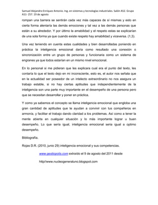 El documento describe la inteligencia emocional y cómo influye en el trabajo y las interacciones personales. Explica que Daniel Goleman introdujo el término y describe las cualidades emocionales como la empatía, el control de emociones y la perseverancia. También explica cómo desarrollar la inteligencia emocional crea una conexión entre las personas que mejora el desempeño laboral.