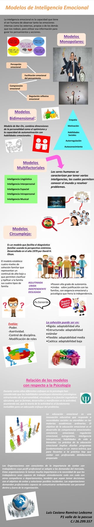 El documento presenta diferentes modelos de inteligencia emocional, incluyendo modelos monopolar, bidimensional y multifactorial. También describe el modelo circumplejo que evalúa el poder, asertividad, control de disciplina y modificación de roles en familias, y clasifica la cohesión familiar como rígida, estructurada, flexible o caótica. Además, explica que la educación emocional busca desarrollar competencias emocionales a través de programas diseñados por profesores capacitados.