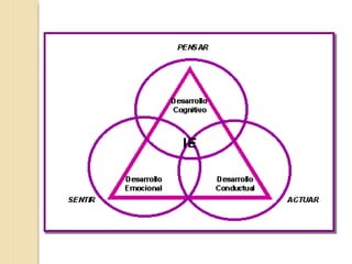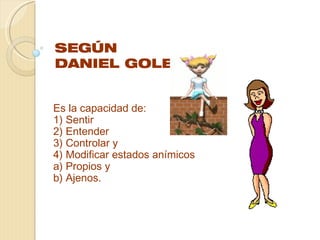 El documento describe los conceptos de inteligencia emocional y sus componentes principales según Daniel Goleman, incluyendo la inteligencia interpersonal e intrapersonal. También discute temas como el desarrollo de la autoestima, la enseñanza de habilidades sociales, y consejos para la relación con adolescentes.
