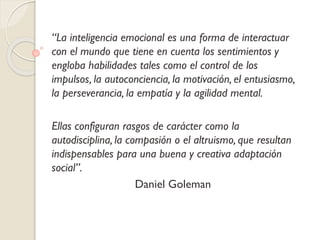 El documento resume conceptos clave sobre inteligencia emocional extraídos del libro de Daniel Goleman de 1995, incluyendo que la inteligencia emocional se refiere a habilidades como el control de impulsos, la autoconciencia y la empatía; que las emociones guían nuestro desempeño y son importantes para el aprendizaje; y que programas de educación emocional han demostrado mejorar habilidades sociales y emocionales en niños.