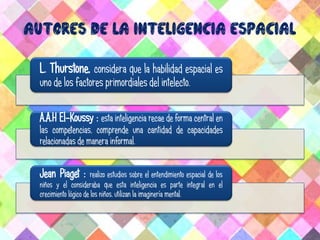 La inteligencia espacial, según varios autores, es una habilidad primordial del intelecto que se desarrolla entre los 5 y 10 años, y está relacionada con la percepción y manipulación de objetos en entornos tridimensionales. Jean Piaget destacó la importancia de esta inteligencia en el crecimiento lógico infantil y su conexión con la imaginería mental. El lóbulo parietal juega un papel crucial en la capacidad para reconocer objetos, leer mapas y entender relaciones espaciales.