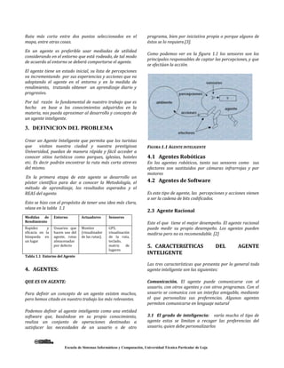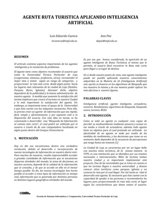 El documento describe el desarrollo de un agente inteligente que recomienda rutas turísticas óptimas para visitantes de la Universidad Técnica Particular de Loja. El agente utiliza algoritmos de búsqueda como A* para encontrar la ruta más corta entre dos puntos, considerando factores como parques, hoteles e iglesias. El agente mejorará la experiencia de los turistas y promoverá el turismo en la ciudad.