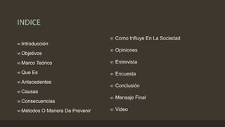 Este documento presenta una introducción al tema de la inteligencia interpersonal. Incluye una sección sobre objetivos como informar a la sociedad e inspirar a estudiantes. También contiene secciones sobre la definición de inteligencia interpersonal, sus características, antecedentes históricos, causas, consecuencias y métodos de prevención. Por último, incluye opiniones de varias personas sobre la importancia de la inteligencia interpersonal en la sociedad.